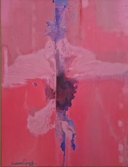 A artista trabalha com sobreposições, escorrimentos conduzidos e manchas planejadas, criando superfícies nas quais a matéria pictórica participa diretamente da construção da imagem. Cada etapa do processo é pensada em função do equilíbrio da composição e da relação entre os elementos.