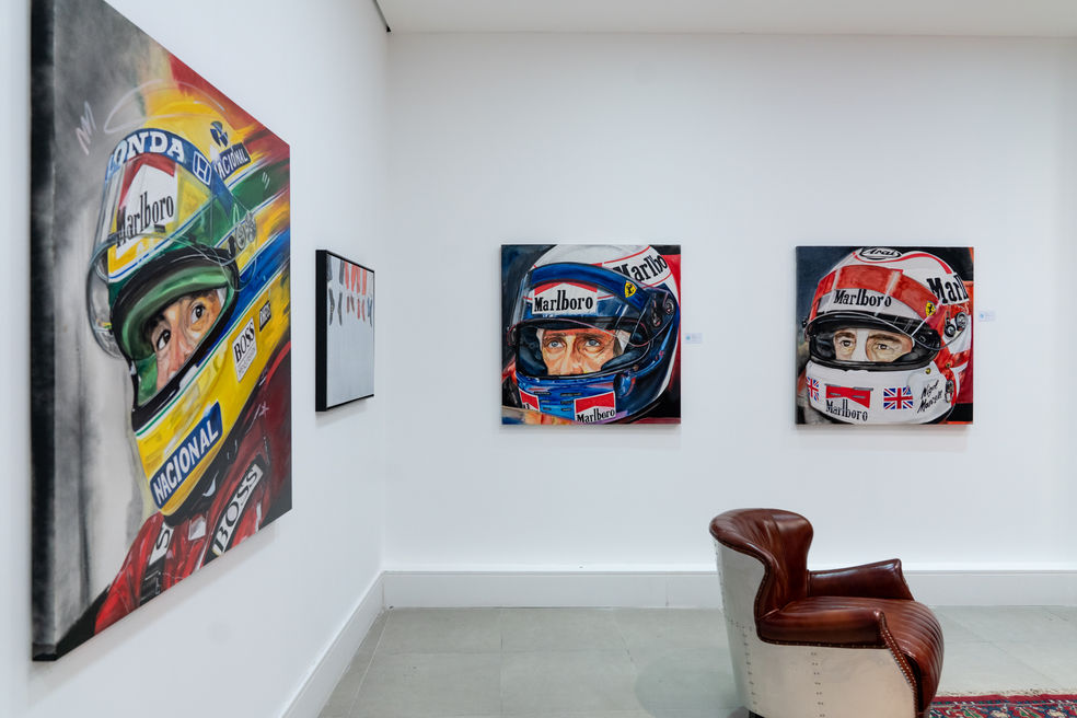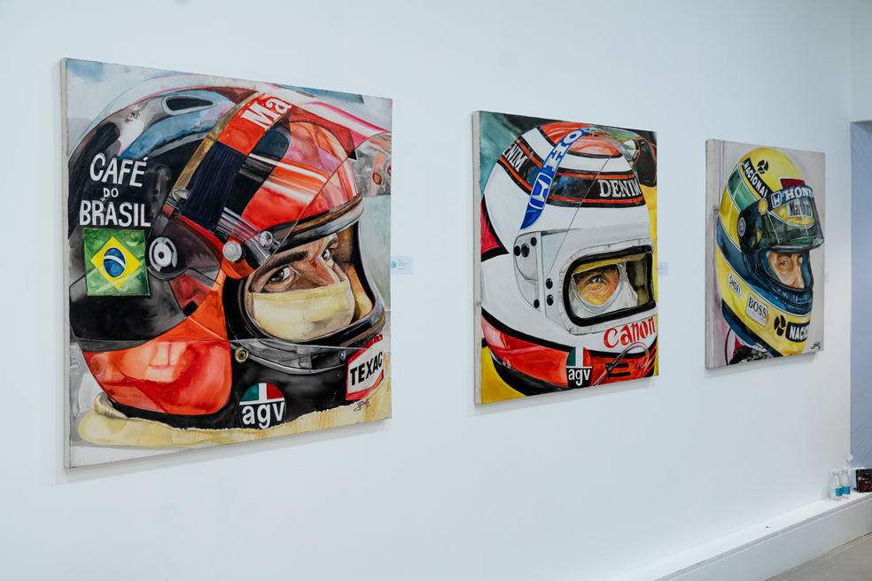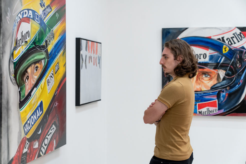 Escrever sobre Fórmula na pintura é lidar com um imaginário que já nasce carregado de adrenalina, memória e mito. J. Pilatti, nascido em São Paulo, compreende esse simbolismo e escolhe não competir com ele. Ao contrário, ele o desacelera. Sua exposição não trata do carro em disparada, nem da curva em alta velocidade. Trata do instante anterior. Do olhar que antecede a largada.