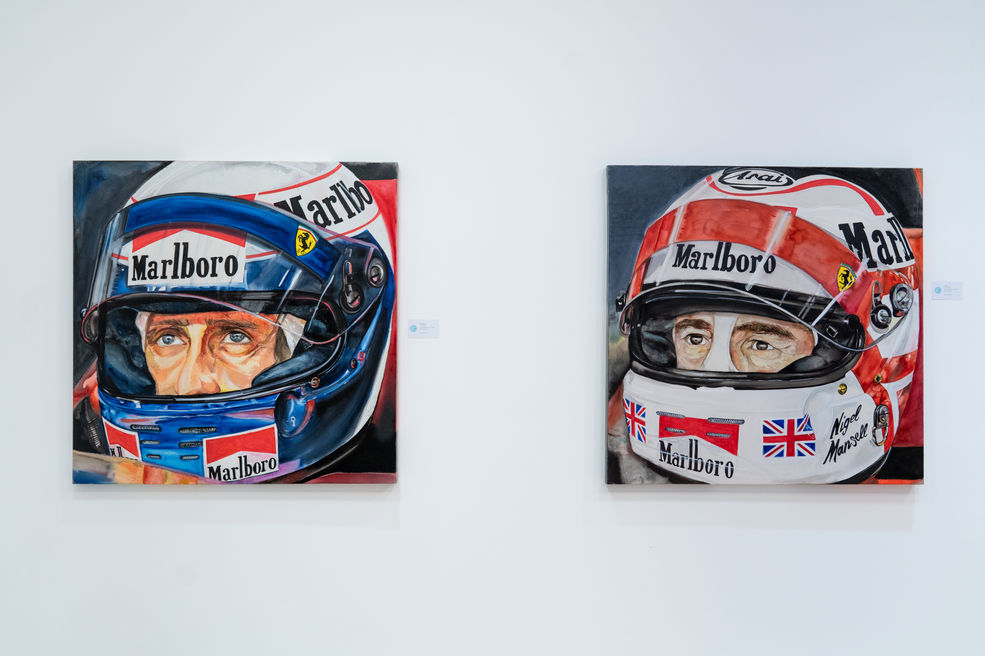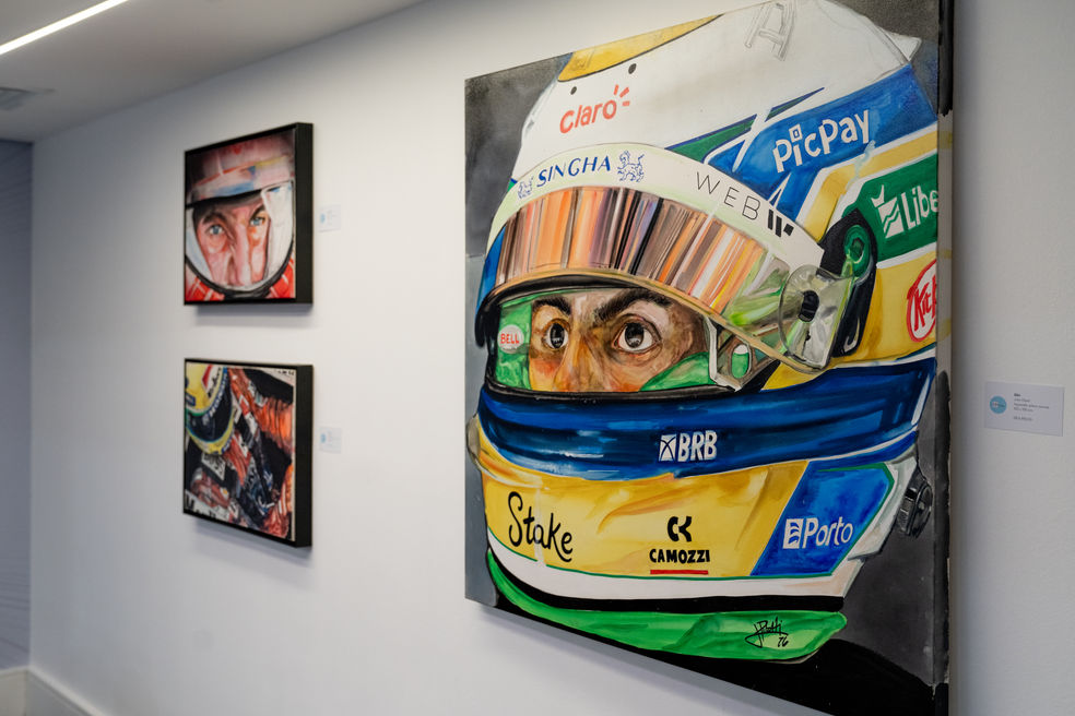 Em vez de carros, vemos capacetes. Em vez de pistas, vemos olhos. Os pilotos surgem em enquadramentos fechados, frontais, quase íntimos. Marcas históricas, patrocínios, cores icônicas situam cada imagem em um tempo específico, ativam memórias coletivas e constroem uma cartografia do esporte. Senna, por exemplo, é um marco afetivo nacional. Outros nomes compõem esse conjunto como fragmentos de uma narrativa maior, feita de conquistas, derrotas e expectativa.